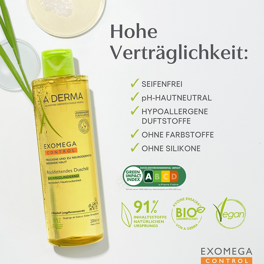 Das rückfettende A-DERMA EXOMEGA Control Duschöl ist für trockene und zu Neurodermitis neigende Haut geeignet.Es lindert Juckreiz und vermindert die Hauttrockenheit um -95% nach 3 Wochen Anwendung*.