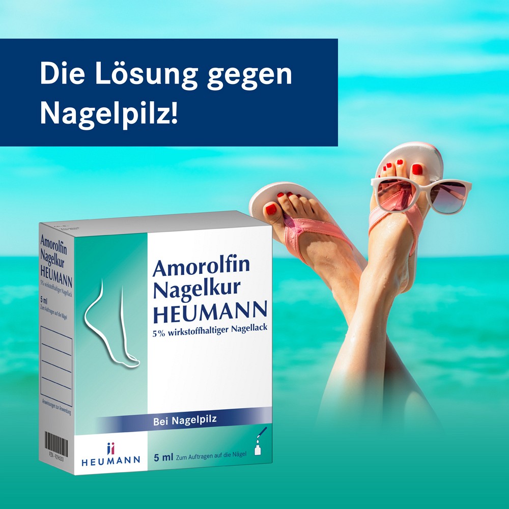 Amorolfin Nagelkur Heumann ist ein hochwirksames Arzneimittel zur gezielten Behandlung von Pilzinfektionen auf der Nageloberfläche und den Nagelrändern bei bis zu zwei Nägeln. Der wasserfeste Nagellack eignet sich ideal für Sport und Freizeit und muss nur 1x wöchentlich angewendet werden.