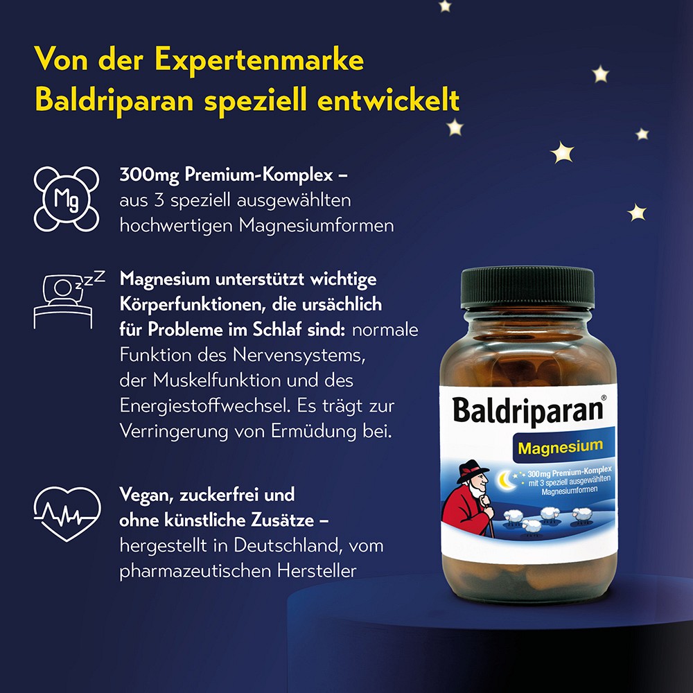 - Von der Expertenmarke Baldriparan speziell entwickelt – Viele Probleme im Schlaf stehen mit Magnesium in Verbindung.