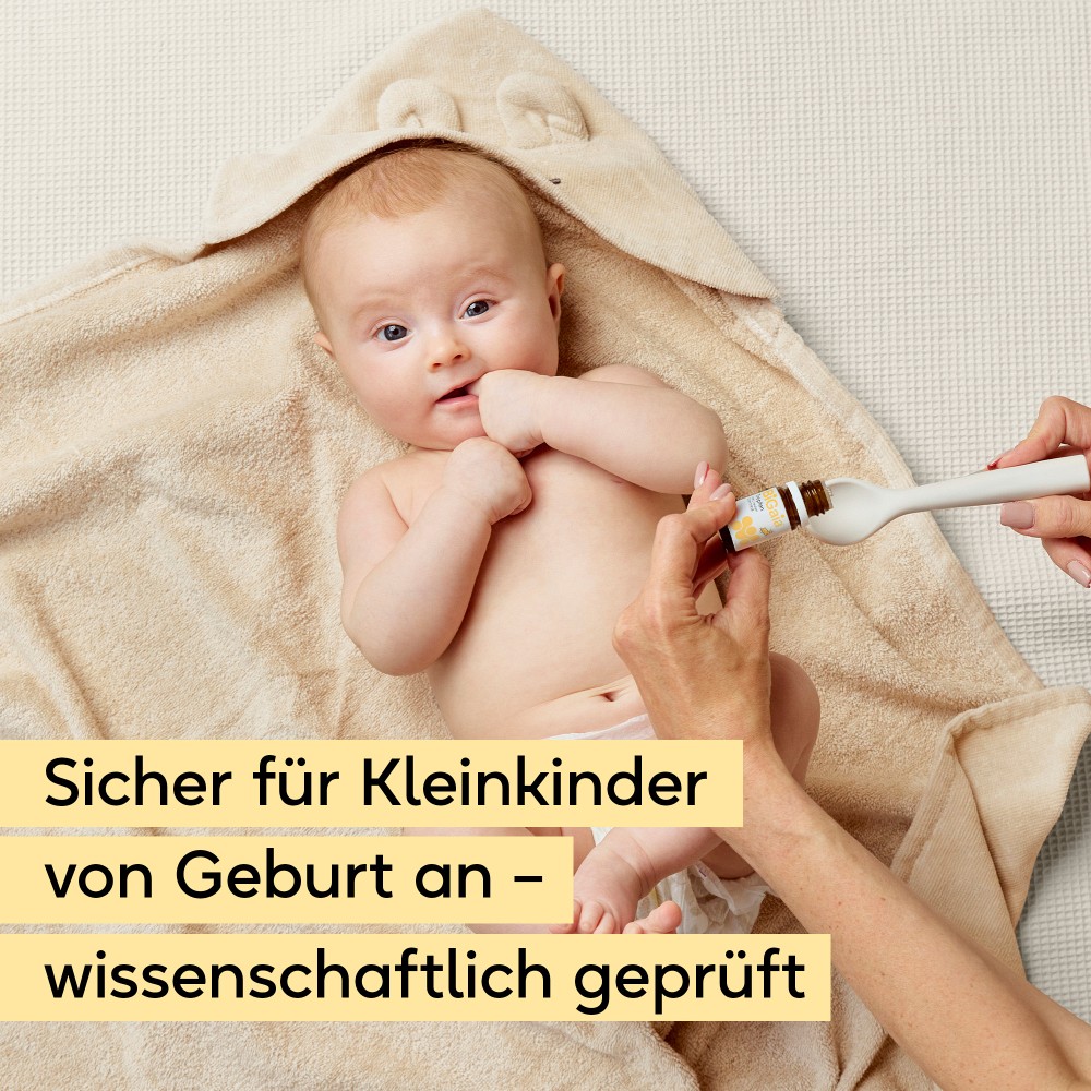 Unabhängig vom Alter nehmen Kinder und Erwachsene 5 Tropfen täglich ein. Unverdünnt mit einem Löffel geben. Nicht mit heißen Lebensmitteln mischen oder direkt aus der Flasche geben, da dies die Qualität des Produktes beeinträchtigen könnte. 5ml entsprechen 21 Tagen.