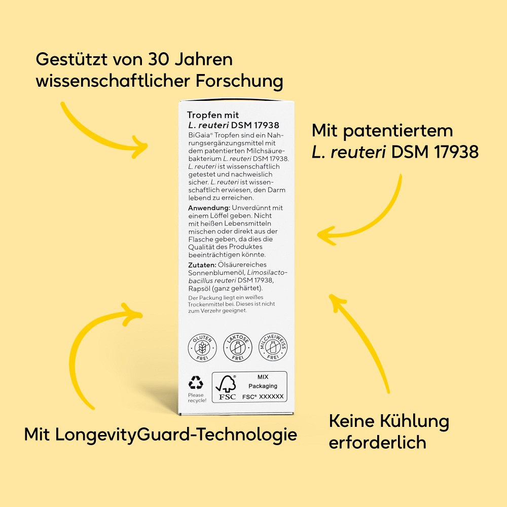 BiGaia®, Tropfen. Nahrungsergänzungsmittel mit L. reuteri DSM 17938