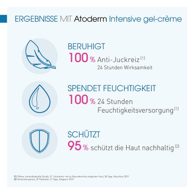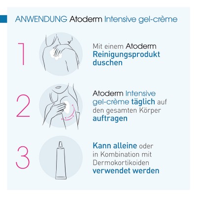 Atoderm Intensive gel-crème 1-2-mal täglich auf die gereinigte Haut auftragen. Zieht sehr schnell ein.