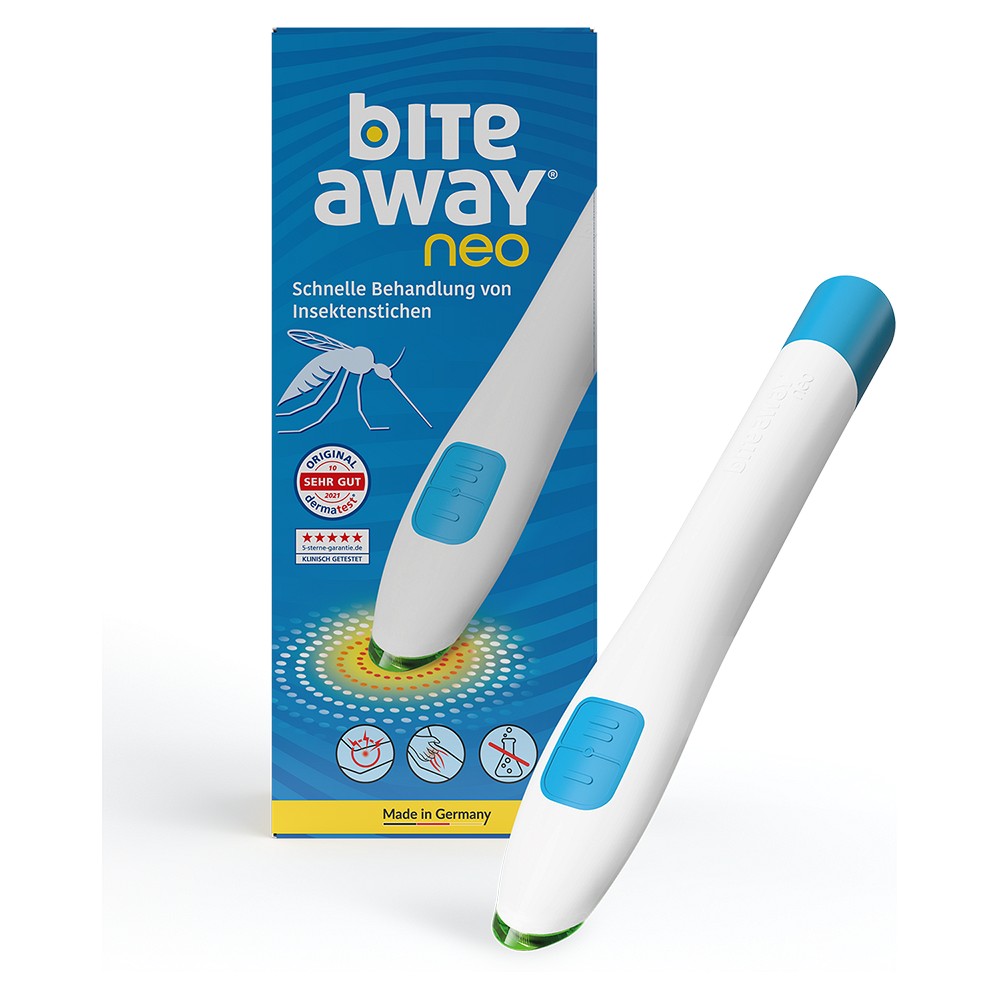 Der Original-Stichheiler bite away® besitzt eine effektive Wärmetherapie-Technologie, die bei Insektenstichen in einer handlichen Stiftgröße innerhalb einer Minute nachhaltige Linderung vom Juckreiz bieten kann. bite away® neo ist die weiterentwickelte Form des bite away® Original-Stichheilers, der zusätzliche Features besitzt, wie Wasserdichtigkeit (IP65) für Anwendung in Wassernähe, LED-Ring für Benutzung in der Nacht, modernere Signaltöne bzw. Stummschaltung, und die Möglichkeit zur Anwendung mit wiederaufladbaren Akkus. Der weiterentwickelte Original-Sichheiler kann mit einem Satz Batterie bis zu 700 Anwendungen liefern.Effektivität: