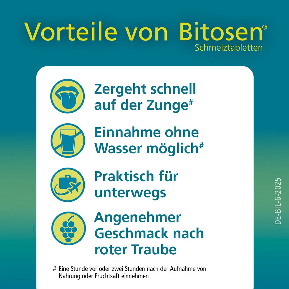 Bitosen* Schmelztabletten zergehen schnell auf der Zunge und können ohne Wasser eingenommen werden# – ideal für unterwegs.