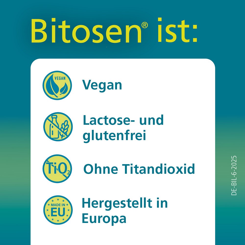 Außerdem sind Bitosen* Schmelztabletten vegan, lactose- und glutenfrei, ohne Titandioxid, in Europa produziert.
