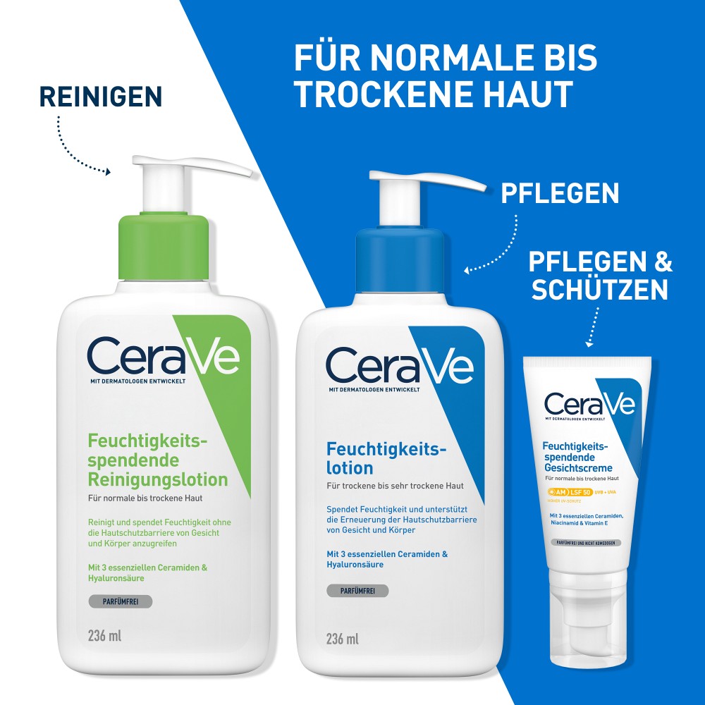 Hydratisierende Reinigung für normale bis trockene Haut von Gesicht und Körper Die CeraVe Feuchtigkeitsspendende Reinigungslotion mit Hyaluron, den drei essenziellen Ceramiden 1, 3 und 6-II und Glycerin reinigt schonend, fördert den Erhalt der natürlichen Hautschutzbarriere und erhöht die Hautfeuchtigkeit ab der ersten Anwendung.
