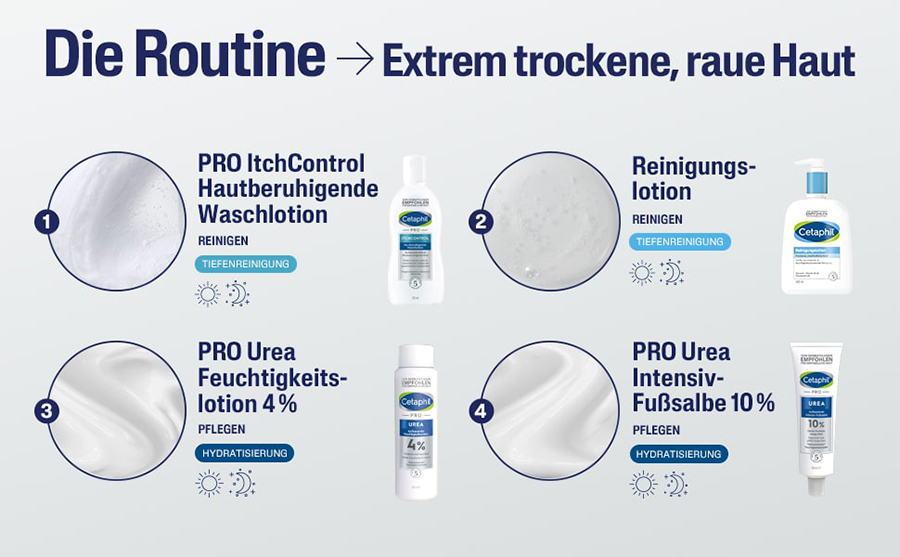 Die Anwendung von Cetaphil PRO Urea 4% aufbauende Feuchtigkeitslotion ist einfach: Tragen Sie die Lotion täglich auf Ihre trockene und raue Haut auf – bei Bedarf auch gerne mehrmals täglich.