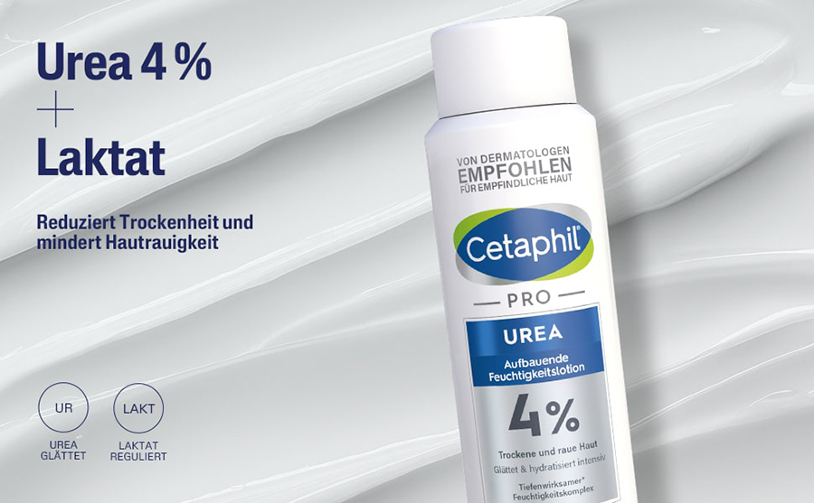Cetaphil PRO Urea 4% aufbauende Feuchtigkeitslotion ist eine reichhaltige Pflege für trockene und raue Haut. Dank der besonders reichhaltigen Formulierung kann der natürliche Feuchtigkeitskomplex aus Urea & Laktat eine besonders tiefenwirksame & langanhaltende Wirkung entfalten. Der Wassergehalt der Haut wird sofort und langanhaltend erhöht, gleichzeitig stärken wertvolle Lipide die natürliche Hautbarriere und helfen so, die Haut vor dem Austrocknen zu schützen.  So wird Ihre Haut hydratisiert, gepflegt und geglättet, die Hautbarriere gestärkt und die Regeneration der Haut unterstützt. Für ein angenehme glattes, weiches und gesundes Hautgefühl, mit dem Sie sich wieder wohl fühlen. Auch in der Begleitpflege von Neurodermitis oder altersbedingter Xerose geeignet und klinisch getestet.