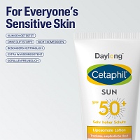 Cetaphil Sun Daylong SPF 50+ Liposomale Lotion ist eine dermatologische Sonnencreme für trockene, empfindliche Haut. Die in der Lotion enthaltenen photostabilen UV-Filter sorgen für sofortigen und hochwirksamen UVA- und UVB-Schutz. Dank ihrer liposomalen Eigenschaften lässt sich die Sonnenlotion leicht auf dem Körper verteilen, zieht schnell ein, klebt und fettet nicht und hinterlässt ein hervorragendes Hautgefühl.