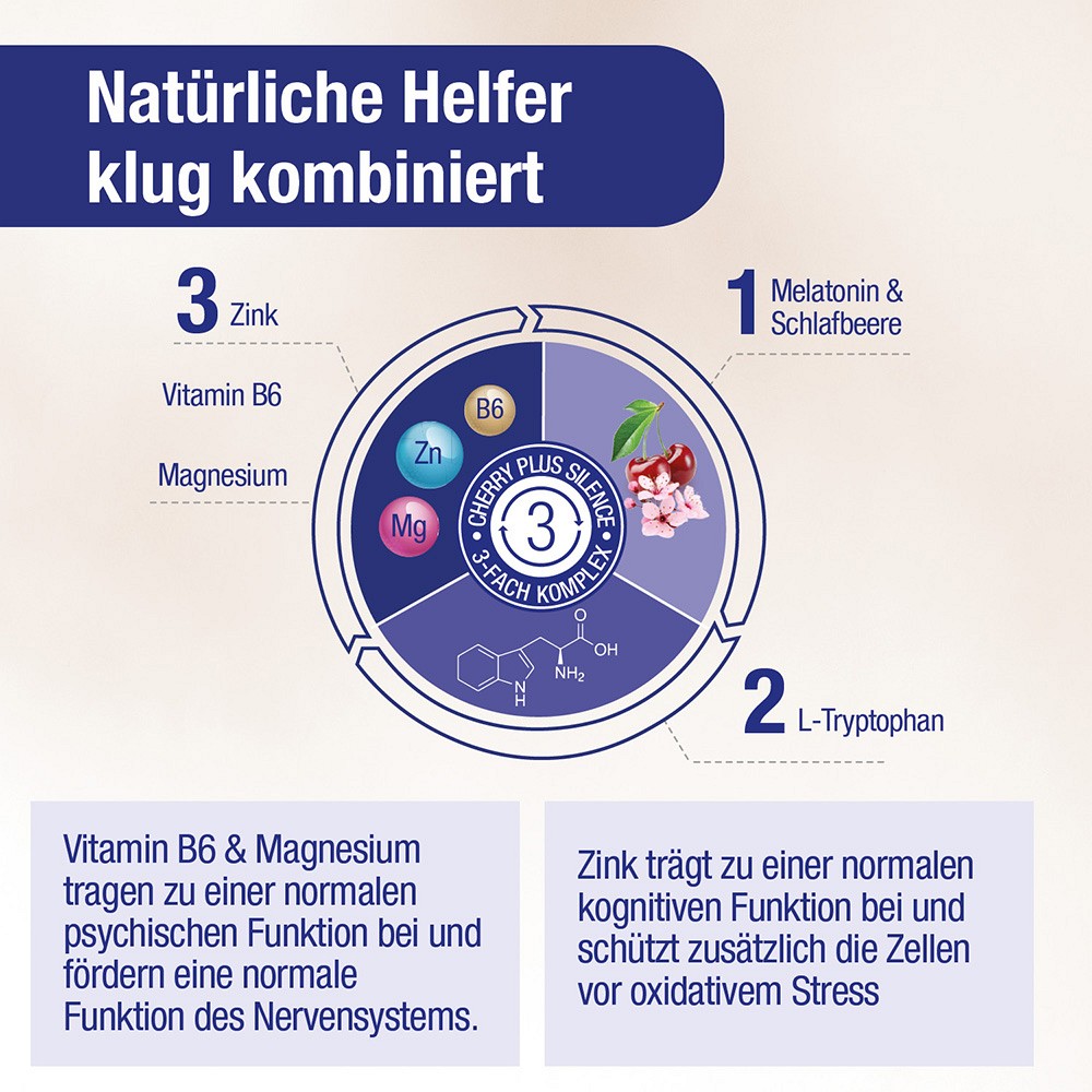 Neben dem Montmorency-Sauerkirsche-Extrakt enthält Cherry PLUS Silence wichtige Co-Faktoren wie 56,26 mg Magnesium, 5 mg Zink und 1,4 mg Vitamin B6 - ohne jegliche Zusätze. Magnesium und Vitamin B6 tragen zu einer normalen psychischen Funktion und einem ausgeglichenen Nervensystem bei. Zink unterstützt die kognitive Funktion und schützt die Zellen vor oxidativem Stress.Natürlich ruhig – Tag und Nacht