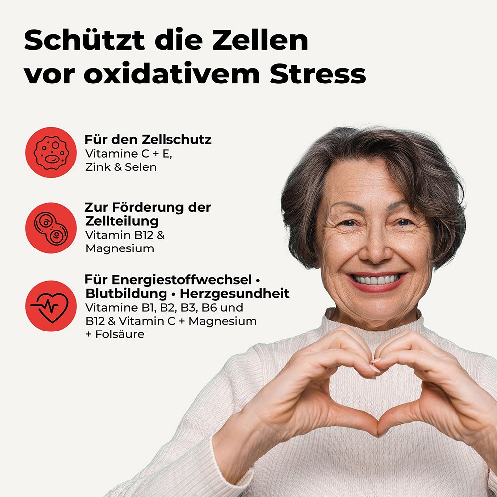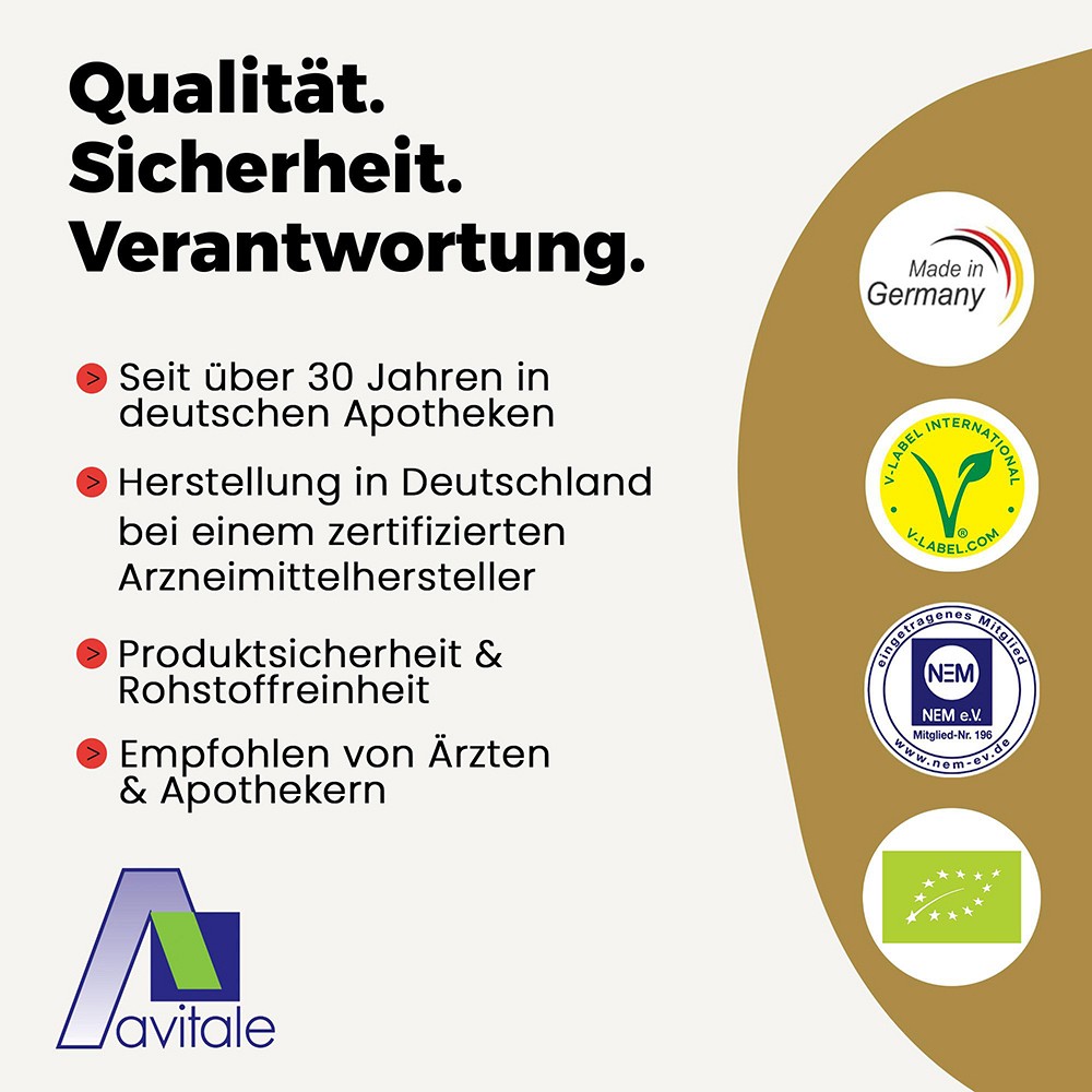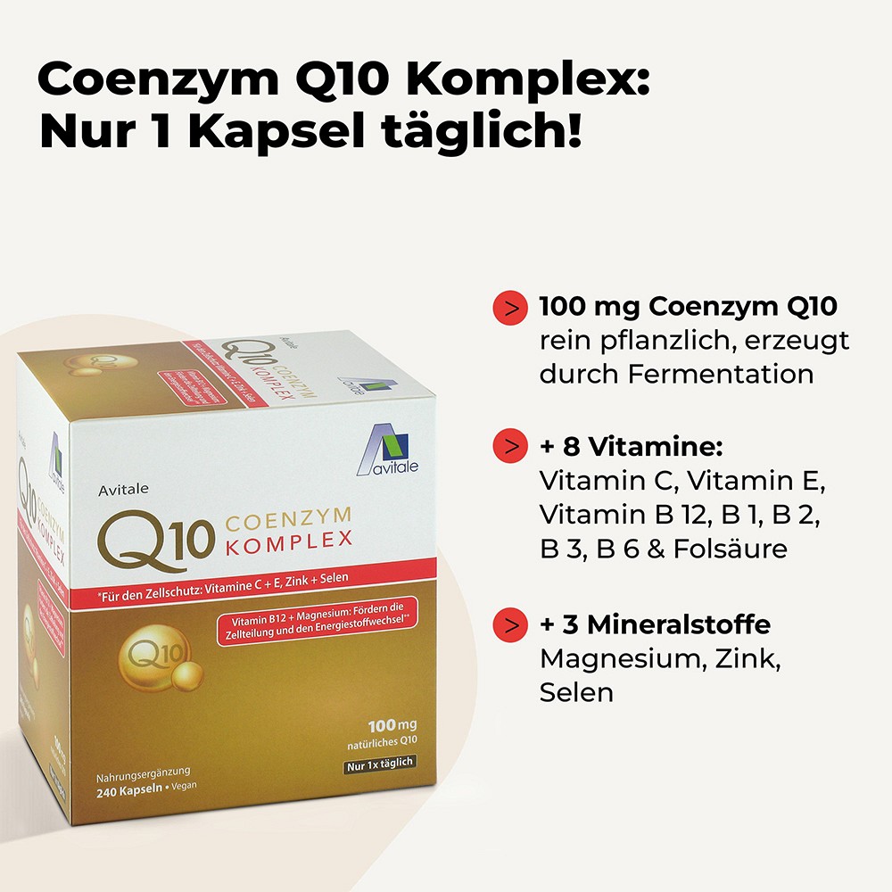 Avitale Q10 Coenzym Komplex Kapseln enthalten pro Kapsel 100 mg rein pflanzliches Q10, erzeugt durch Fermentation. Ergänzend sind 8 hochwertige Vitamine und 3 Mineralstoffe enthalten, die für das menschliche Wohlbefinden wertvoll sind.Nahrungsergänzungsmittel mit 100mg rein pflanzlichem Coenzym Q10, Vitamin C und E sowie Zink und Selen zum Schutz der Zellen vor oxidativem Stress* sowie Vitamin B12 und Magnesium zur Förderung der Zellteilung und für einen normalen Energiestoffwechsel.