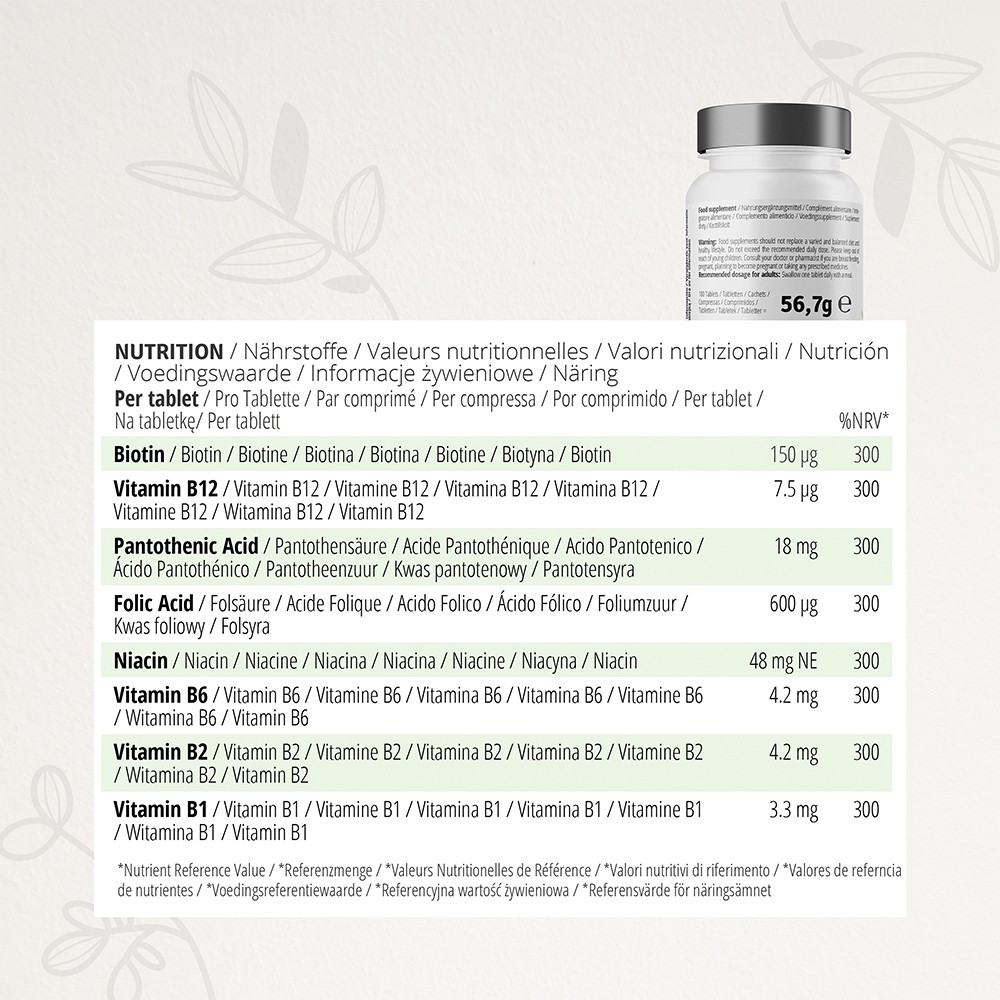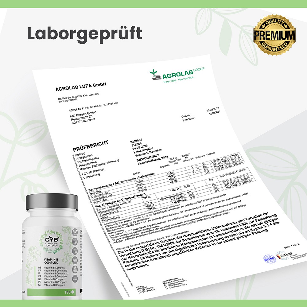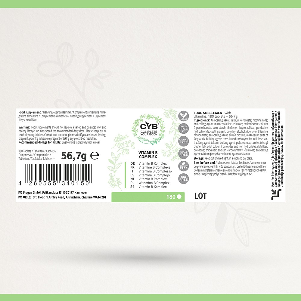 Das Nahrungsergänzungsmittel ist vegan, gluten-, laktose- und sojafrei und unterstützt mit 180 Tabletten für 6 Monate dabei, den täglichen Bedarf an Vitaminen und Mineralien zu decken. Complete Your Body - mit CYB Vitamin-B Komplex!