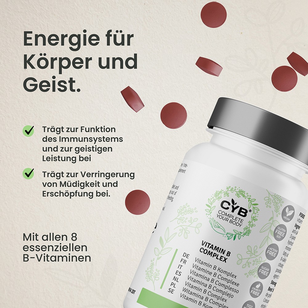 Damit besondere Herausforderungen im Alltag ideal gemeistert werden können, ist eine optimale Energieversorgung des Körpers wichtig. Mit dem CYB Vitamin-B Komplex Nahrungsergänzungsmittel wird der Energiestoffwechsel mit allen acht B-Vitaminen versorgt. So können Müdigkeitserscheinungen und Erschöpfung entgegengewirkt sowie die Funktion des Gedächtnis- und Erinnerungsvermögens unterstützt werden.Unter den acht B-Vitaminen, die als Vitamin-B Komplex bezeichnet werden, tragen die Vitamine B1, B2, B3, B5, B6, B12 und Biotin zu einem normalen Energiestoffwechsel bei. Unterdessen unterstützen die Vitamine B1, B2, B3, B6 und Biotin eine normale psychische Funktion sowie eine normale Funktion des Nervensystems.