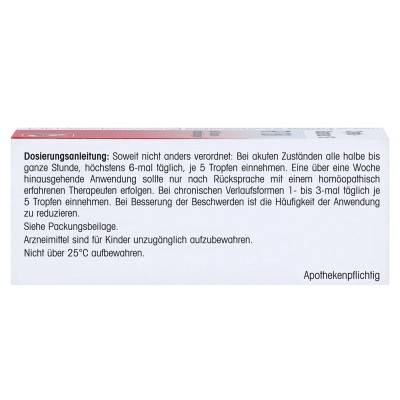 Soweit nicht anders verordnet: Bei akuten Zuständen alle halbe bis ganze Stunde, höchstens 6-mal täglich, je 5 Tropfen einnehmen. Eine über eine Woche hinausgehende Anwendung sollte nur nach Rücksprache mit einem homöopathisch erfahrenen Therapeuten erfolgen.Bei chronischen Verlaufsformen 1- bis 3-mal täglich je 5 Tropfen einnehmen. Bei Besserung der Beschwerden ist die Häufigkeit der Anwendung zu reduzieren.