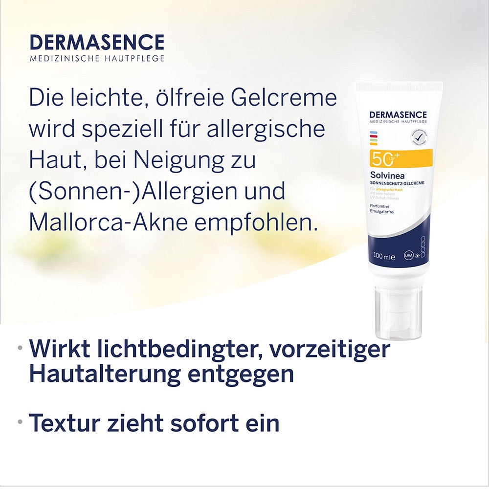 - Die leichte, ölfreie Gelcreme mit sehr hohem UV-Schutz wird speziell bei Neigung zu (Sonnen-)Allergien und Mallorca-Akne empfohlen