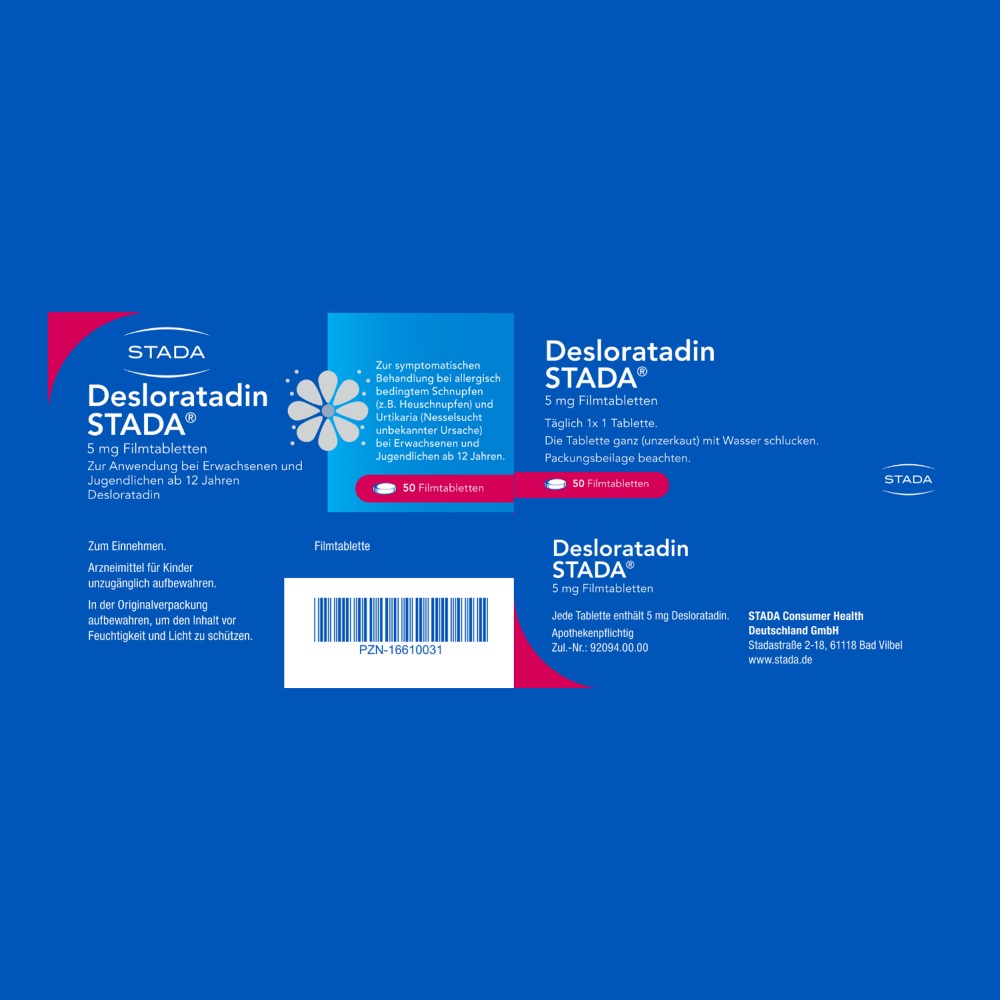 Desloratadin STADA® bessert die Symptome bei allergischer Rhinitis (durch eine Allergie hervorgerufene Entzündung der Nasengänge, beispielsweise Heuschnupfen oder Hausstaubmilben-Allergie). Diese Symptome beinhalten Niesen, laufende oder juckende Nase, Juckreiz am Gaumen und juckende, gerötete oder tränende Augen. Es wird ebenfalls angewendet zur Besserung der Symptome bei Urtikaria (ein durch eine Allergie hervorgerufener Hautzustand). Diese Symptome beinhalten Juckreiz und Quaddeln. Die Besserung dieser Symptome hält einen ganzen Tag an und hilft Ihnen, Ihre normalen Alltagsaktivitäten wieder aufzunehmen und Ihren Schlaf wiederzufinden. Wenn Sie sich nach 10 Tagen nicht besser oder gar schlechter fühlen, wenden Sie sich an Ihren Arzt.