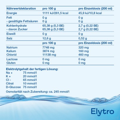 Geeignet für Kinder ab 3 Jahren, Jugendliche und Erwachsene. Nicht zur Selbstbehandlung schwerer Durchfälle verwenden, die länger als drei Tage andauern. Diabetikern soll Elytro nur nach Rücksprache mit dem behandelnden Arzt gegeben werden.Nicht anwenden bei Ausscheidungsstörungen der Nieren, metabolischer Alkalose, unstillbarem Erbrechen, Kohlenhydrataufnahmestörungen, Bewusstseinstrübungen und Schock sowie bei vorliegender Phenylketonurie. Nicht anwenden bei akutem Flüssigkeitsmangel infolge von Verschlusserkrankungen im Verdauungstrakt.