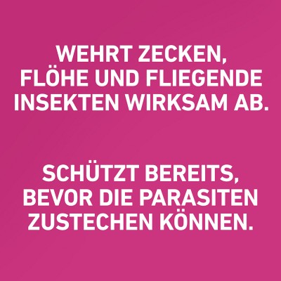 Dabei werden Zecken, Flöhe und auch fliegende Insekten wie Stechmücken vor dem Stich abgewehrt. Auch ein Schutz gegen exotische Parasiten, die sich mehr und mehr auch bei uns heimisch führen, besteht.