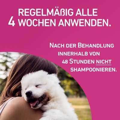 Nach dem Auftragen verteilt sich das Produkt innerhalb von ein bis zwei Tagen mit dem natürlichen Talgfilm der Haut über die gesamte Körperoberfläche des Hundes und wirkt wie ein äußerer, unsichtbarer Schutzmantel gegen Parasiten.