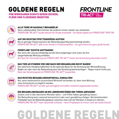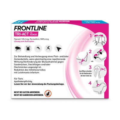 FRONTLINE TRI-ACT® besteht aus einer Wirkstoffkombination, die Zecken, Flöhe und auch fliegende Insekten wie Stechmücken erfolgreich abwehrt und unschädlich macht. So sorgt FRONTLINE TRI-ACT® dafür, dass die Parasiten nicht zustechen und auch für andere Tiere keine Gefahr mehr darstellen.An zwei Stellen im Nacken des Hundes aufgetragen verteilt es sich wie ein natürlicher Schutzfilm über die Haut und senkt so das Risiko gefährlicher, durch Parasiten übertragener Krankheiten wie Leishmaniose.