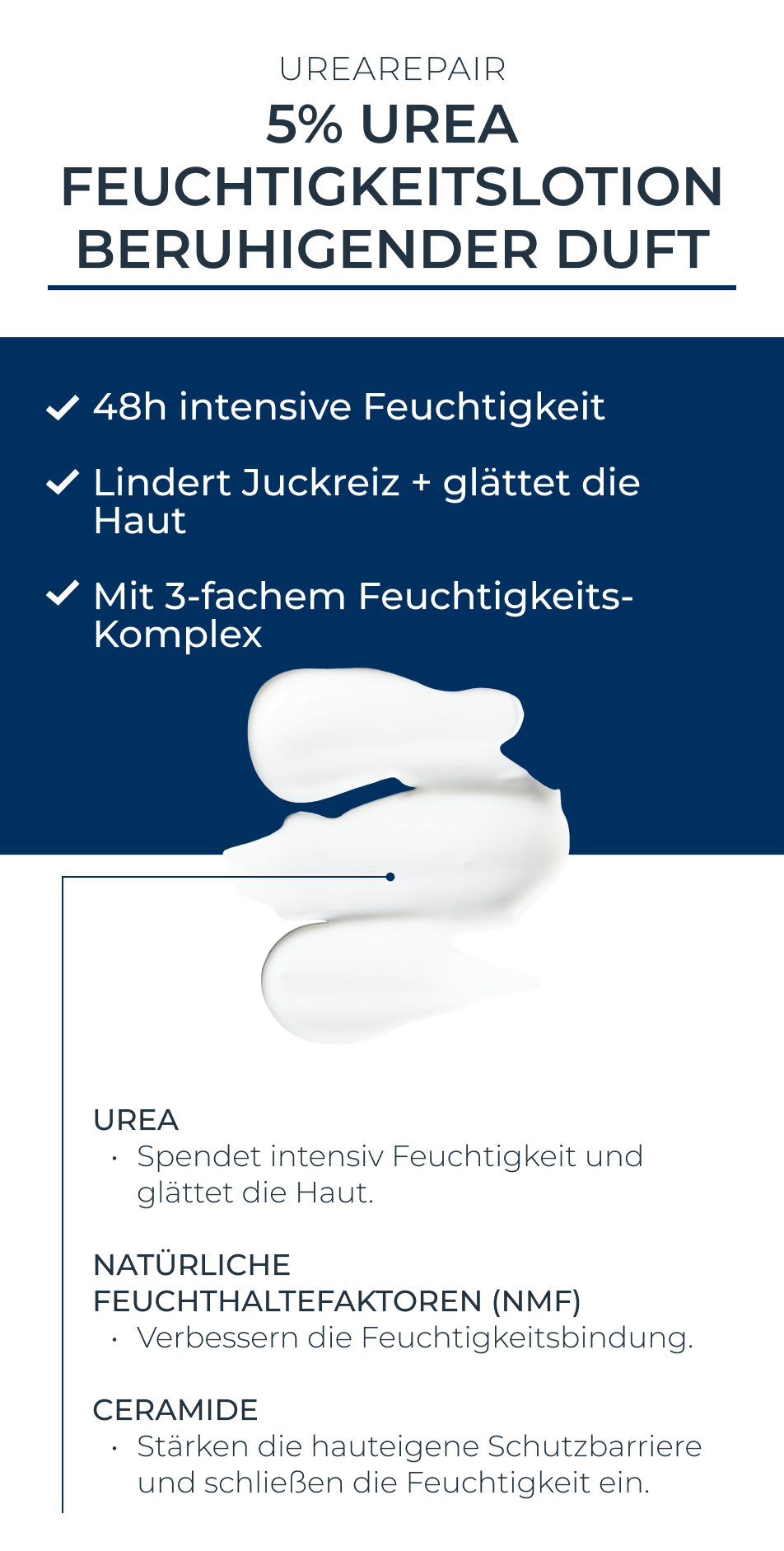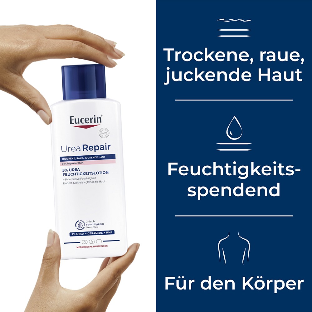 Die Eucerin UreaRepair 5% Urea Feuchtigkeitslotion mit beruhigendem Duft pflegt als Körperlotion hochwirksam sehr trockene, raue und gespannte Haut. Die Pflegecreme zeichnet sich dadurch aus, dass sie die Haut 48 Stunden langanhaltend vor Trockenheit schützt und dabei gegen Anzeichen trockener Haut wirkt. Dank der Öl-in-Wasser Emulsion zieht die leichte Lotion schnell ein, hinterlässt ein geschmeidiges Hautgefühl und stärkt ihre Widerstandskraft.Mit ihrem 3-fachen Pflegekomplex verbessert die Eucerin Urea Creme die Feuchtigkeitsbindung der Haut und erhöht so den Feuchtigkeitsgehalt in den oberen Hautschichten deutlich. Dafür sorgt die Kombination aus dem Wirkstoff Urea mit natürlichen Feuchthaltefaktoren. Zusätzlich schützen Ceramide die Haut, pflegen sie intensiv und können bei regelmäßiger Anwendung die Hautbarriere stärken.