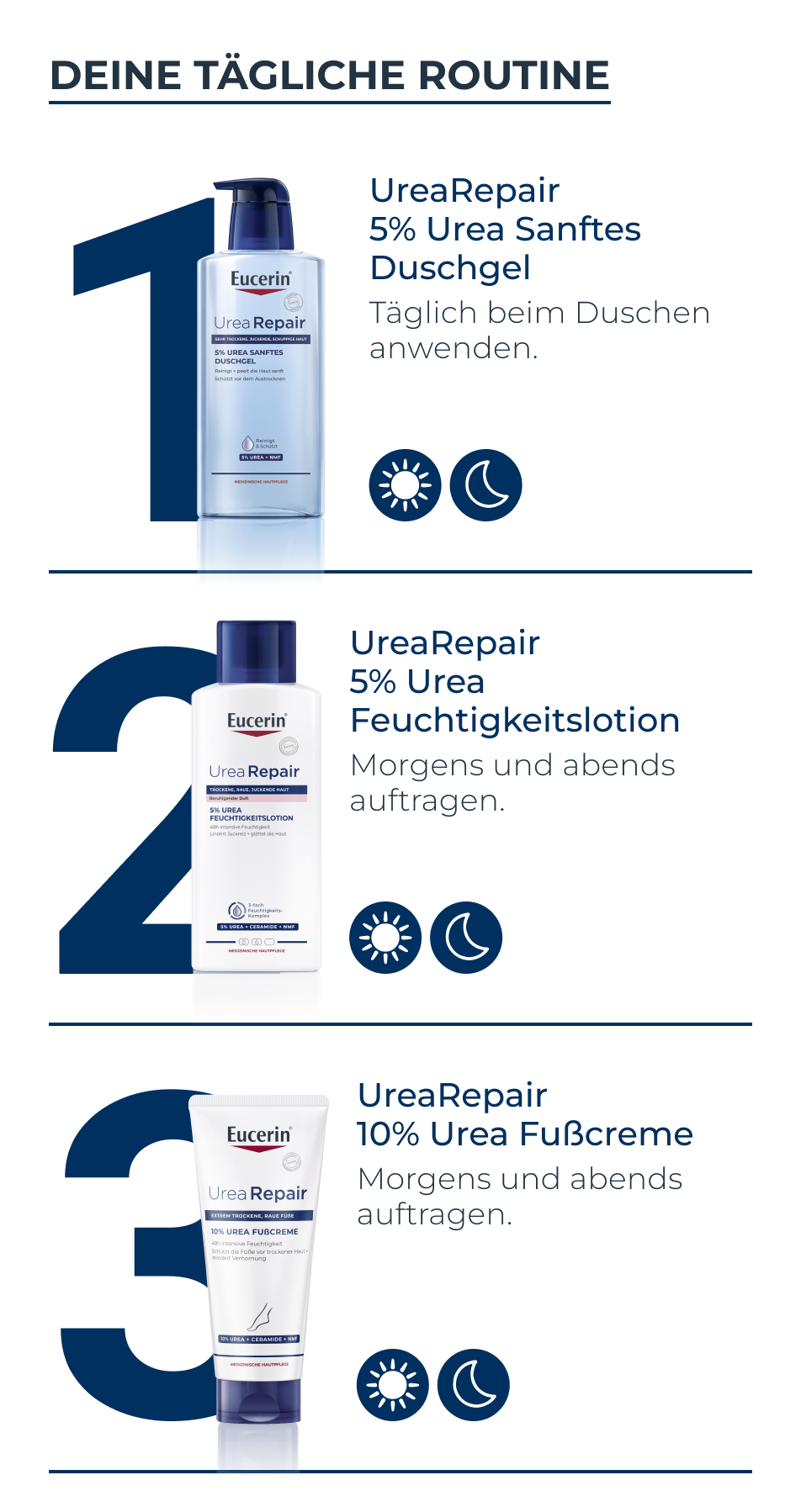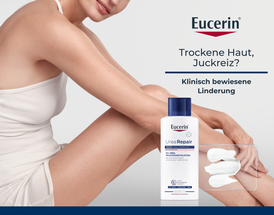 Zur Hautpflege die Eucerin UreaRepair 5% Urea Feuchtigkeitslotion mit beruhigendem Duft auf die trockene Körperhaut auftragen und vollständig einmassieren.Für beste Ergebnisse die Feuchtigkeitslotion in Kombination mit einer Reinigungspflege für trockene Haut wie Eucerin UreaRepair 5% Urea Sanftes Duschgel verwenden.
