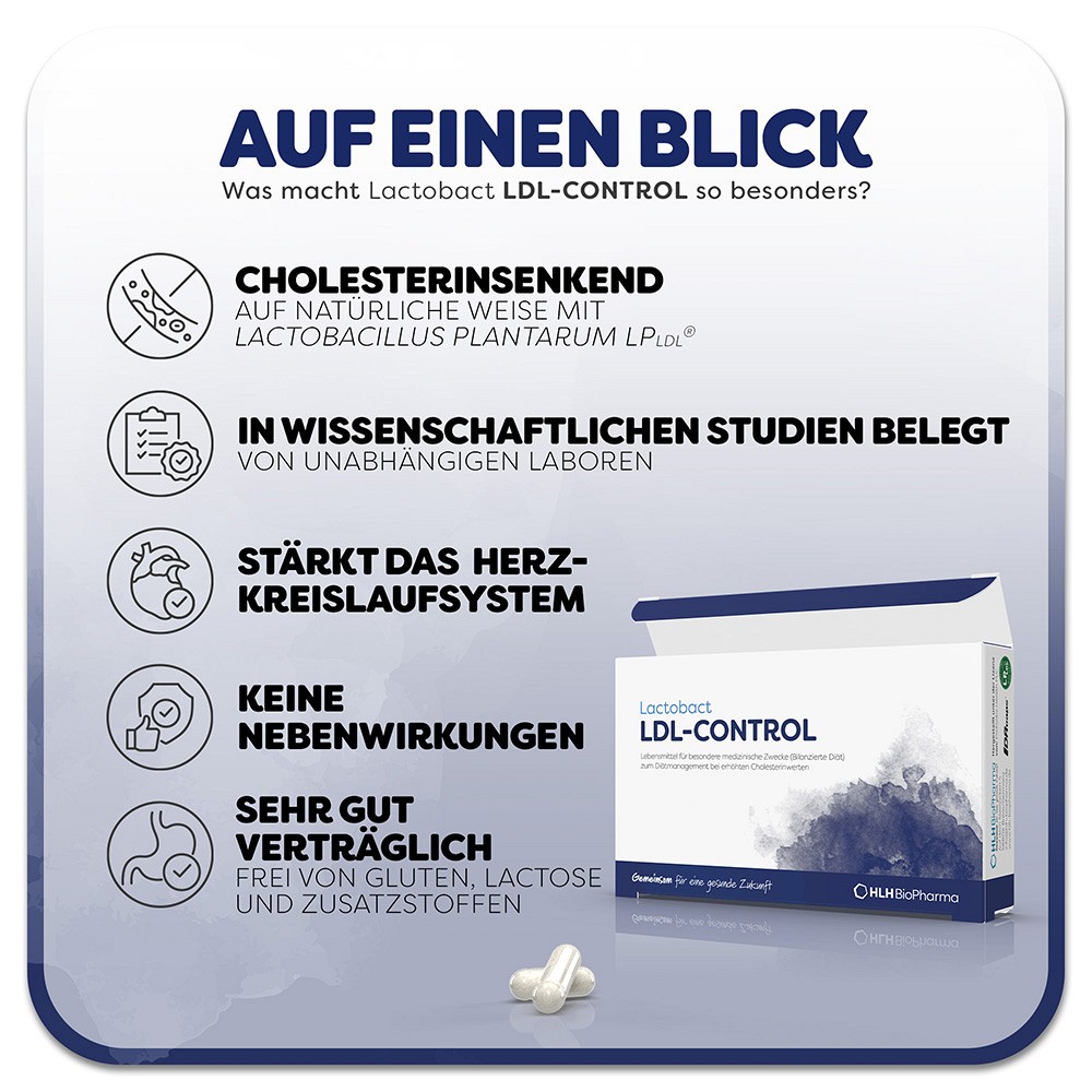 Lactobact LDL-CONTROL ist ein klinisch getestetes, hochwertiges Probiotikum zur natürlichen Senkung erhöhter Cholesterinwerte. Der enthaltene probiotische Bakterienstamm Lactobacillus plantarum LPLDL greift in den natürlichen Cholesterinkreislauf des Körpers ein.Cholesterin ist der wichtigste Baustein für die Bildung unserer Gallensäuren. Diese werden in der Leber gebildet und über die Gallenblase in den Dünndarm ausgeschüttet, wo sie bei der Verwertung unserer Nahrungsfette helfen.