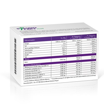 SymbioLact® PLUS enthält 30,0 µg Biotin je Kapsel, das zur Erhaltung normaler Schleimhäute beiträgt. Die enthaltene Menge entspricht 60 % der täglichen empfohlenen Zufuhr für Erwachsene (LMIV-Referenzwert).