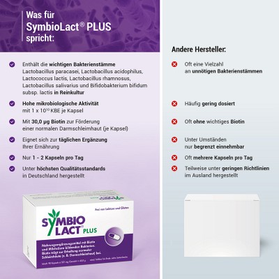 SymbioLact® PLUS ist ein Nahrungsergänzungsmittel mit Biotin sowie sechs verschiedenen Stämmen Milchsäure bildender Bakterien, in der praktischen Kapsel.