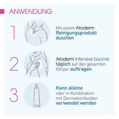 Atoderm Intensive baume 1-2-mal täglich auf die gereinigte Haut auftragen. Zieht sehr schnell ein.