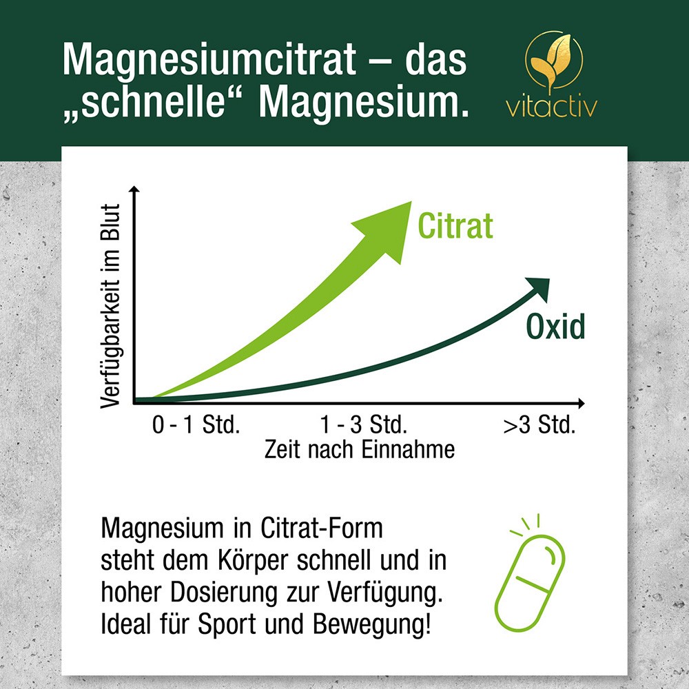 Es steht dem Körper besonders schnell und in hoher Konzentration zur Verfügung. Der Citratanteil fördert die Absorption im Verdauungstrakt und verbessert gleichzeitig die Löslichkeit des Magnesiums.Magnesiumcitrat wird daher gerne bei kurzzeitigen Belastungen wie zur Unterstützung der Fitness bzw. der anschließenden Regeneration, bei Muskelkrämpfen oder einem akuten Magnesiummangel bevorzugt. Daneben ist es für seine besonders gute Verträglichkeit bekannt.