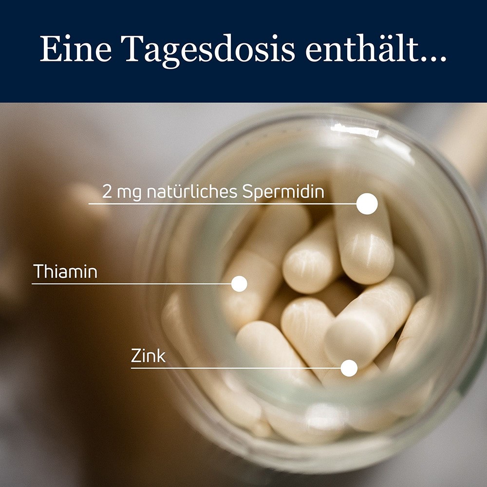 Dieser ist aber besonders wichtig um den Körper langfristig gesund und fit zu halten. Mithilfe der Inhaltsstoffe Thiamin und Zink, die zusätzlich die Zelle vor oxidativem Stress schützen, wird mit spermidineLIFE® Original 365+ die Zellerneuerung optimal und langfristig unterstützt.¹,²