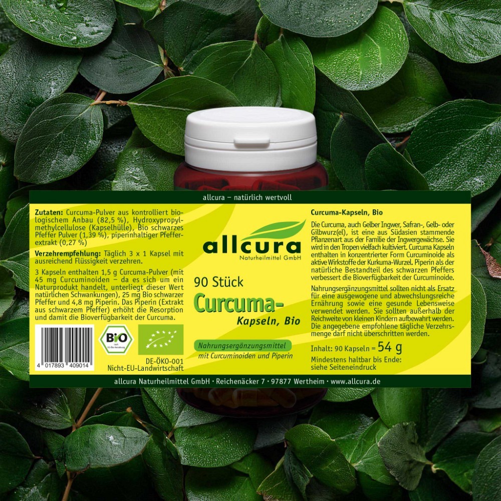 Die Curcuma, auch Gelber Ingwer, Safran-, Gelb- oder Gilbwurz(el), ist eine aus Südasien stammende Pflanzenart aus der Familie der Ingwergewächse. Sie wird in den Tropen vielfach kultiviert. Curcuma Kapseln enthalten in konzentrierter Form Curcuminoide als aktive Wirkstoffe der Curkuma Wurzel. Piperin als natürlicher Bestandteil des schwarzen Pfeffers verbessert die Bioverfügbarkeit des Curcumins.
