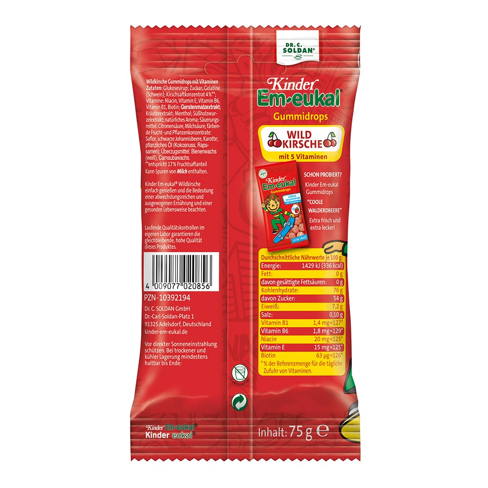 Unbeschwerter Genuss für Groß und Klein: Das beliebte Vitamin-Hustenbonbon Kinder Em-eukal gibt es jetzt auch zum Kauen. Die Kinder Em-eukal Gummidrops Wildkirsche schmecken intensiv-fruchtig und unverwechselbar gut. Hergestellt auf Basis der einzigartigen Geheimrezeptur und in bewährter Premiumqualität.