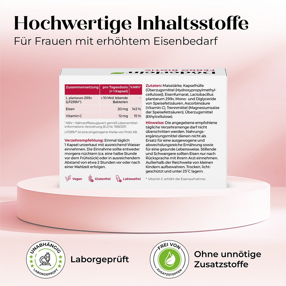 Inspiriert von der Forschung rund um Milchsäurebakterien und das weibliche Wohlbefinden enthält DÖDERLEIN Ferro Biotic den weltweit am besten dokumentierten Milchsäurebakterienstamm Lactiplantibacillus plantarum 299v (LP299V) – mit über 30 Jahren Forschung und mehr als 80 Humanstudien.Dieser Stamm wurde aus der menschlichen Darmschleimhaut isoliert und zählt heute zu den am besten erforschten Milchsäurebakterien weltweit.
