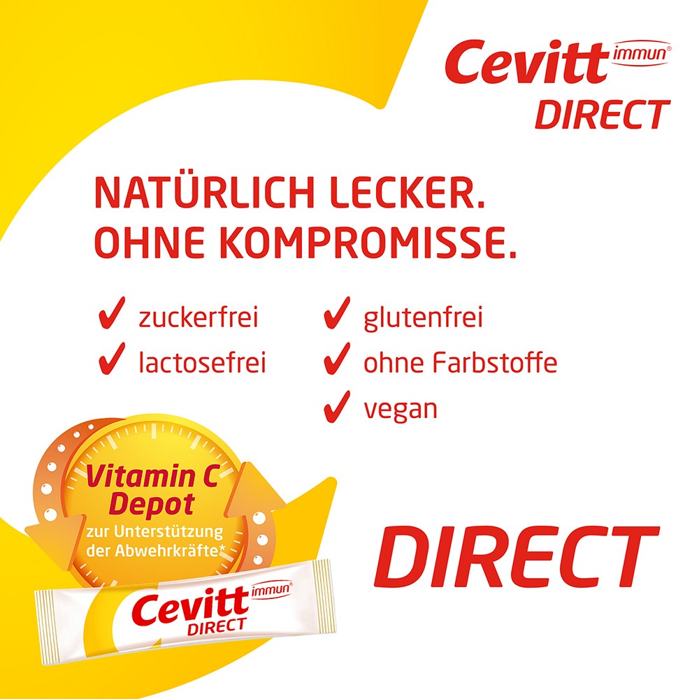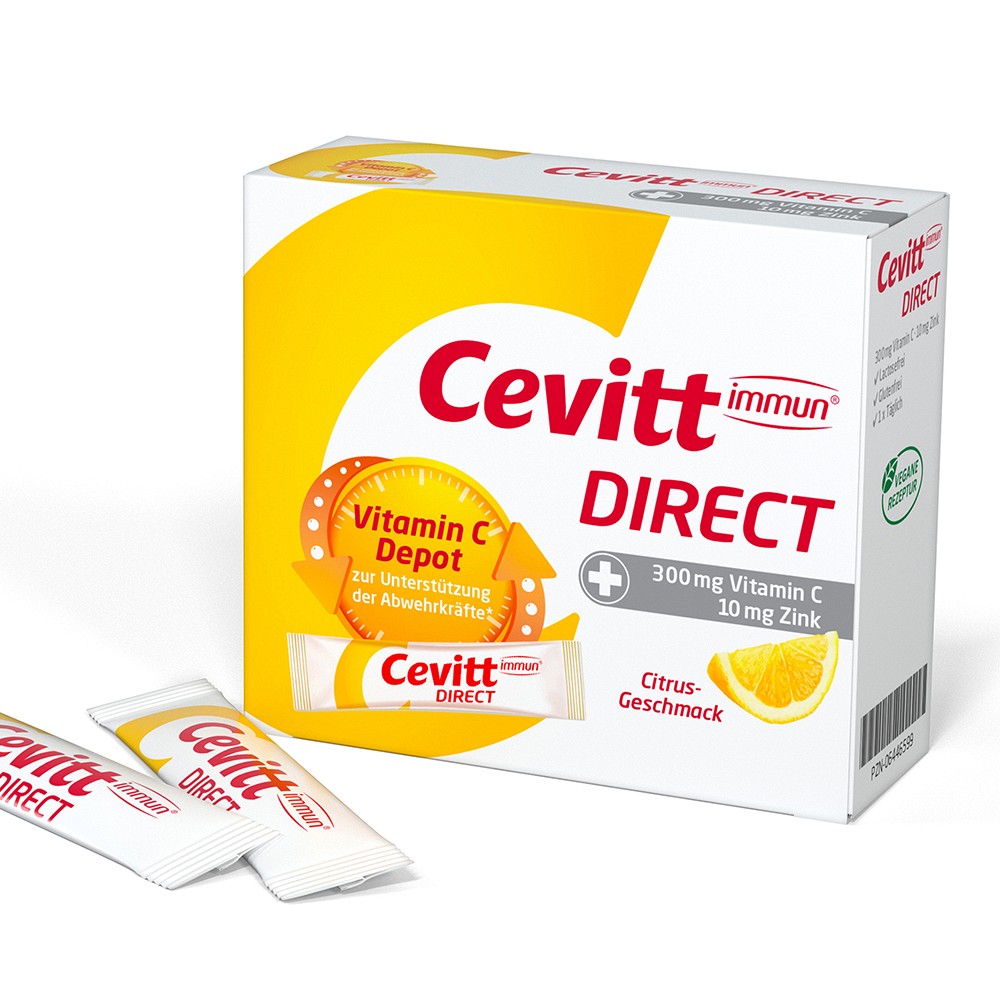 Cevitt immun® direct enthält Vitamin C und Zink und trägt somit zu einer normalen Funktion des Immunsystems bei. Das Pulver zergeht im Mund – ganz ohne Wasser und ist dadurch praktisch für unterwegs.