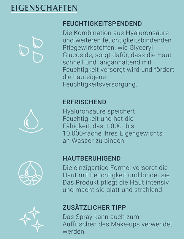 Im Vergleich zu anderen Gesichtssprays, deren Formel ohne feuchtigkeitsspendende Inhaltsstoffe zusammengesetzt ist, wirkt das Eucerin Hyaluron Spray mit den enthaltenen Stoffen Hyaluronsäure und Glyceryl Glucoside. Dank Glyceryl Glucoside wird die Feuchtigkeitsversorgung zwischen den einzelnen Zellen der Haut gesteigert und der Feuchtigkeitshaushalt der Haut von innen heraus gefördert. Somit kann die Feuchtigkeit von der Haut gespeichert werden, sodass sich die Haut glatt und strahlend anfühlt. Hyaluronsäure speichert Feuchtigkeit und bindet das bis zu 10.000-fache ihres Eigengewichts an Wasser.
