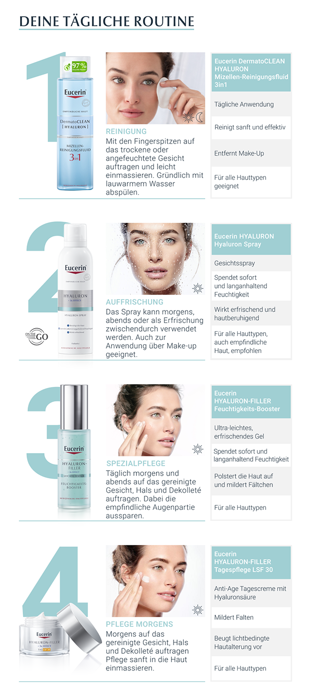 Ein strahlendes, glattes Hautbild benötigt zwei Dinge: Wasser sowie eine feuchtigkeitsspendende Pflege. Bekommt sie das nicht, ist die Haut bald dehydriert, wirkt schnell stumpf, spannt und reagiert mitunter empfindlich auf Umweltreize. Dann muss die Haut intensiv und lange mit Feuchtigkeit versorgt werden.Das Hyaluron Spray von Eucerin mit 3x Effect beruhigt die Haut, spendet sofort und langanhaltend Feuchtigkeit und wirkt erfrischend.