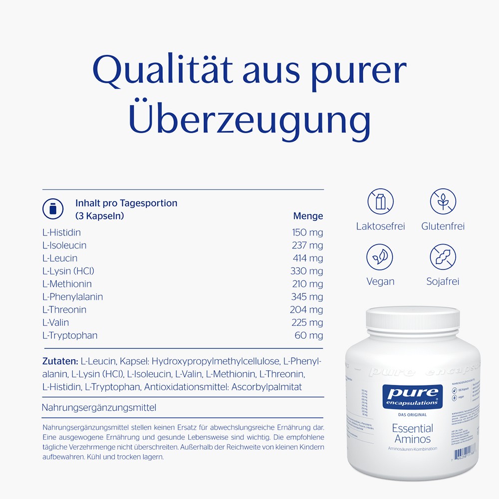 Essenzielle Aminosäuren in optimaler ZusammensetzungEs gibt 20 für den menschlichen Organismus wichtige Aminosäuren. Jedoch kann der Körper nicht alle selbst bilden. Essential Aminos enthält eine ausgewogene Kombination von Aminosäuren, deren Bedarf über die Ernährung oft unzureichend gedeckt wird.