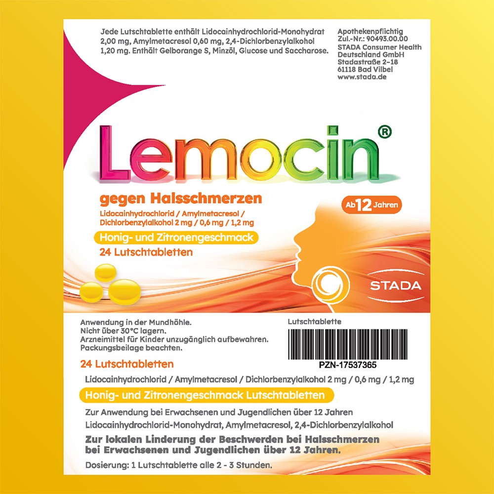 Lemocin® gegen Halsschmerzen Lidocainhydrochlorid / Amylmetacresol / Dichlorbenzylalkohol 2 mg / 0,6 mg / 1,2 mg Honig- und Zitronengeschmack Lutschtabletten