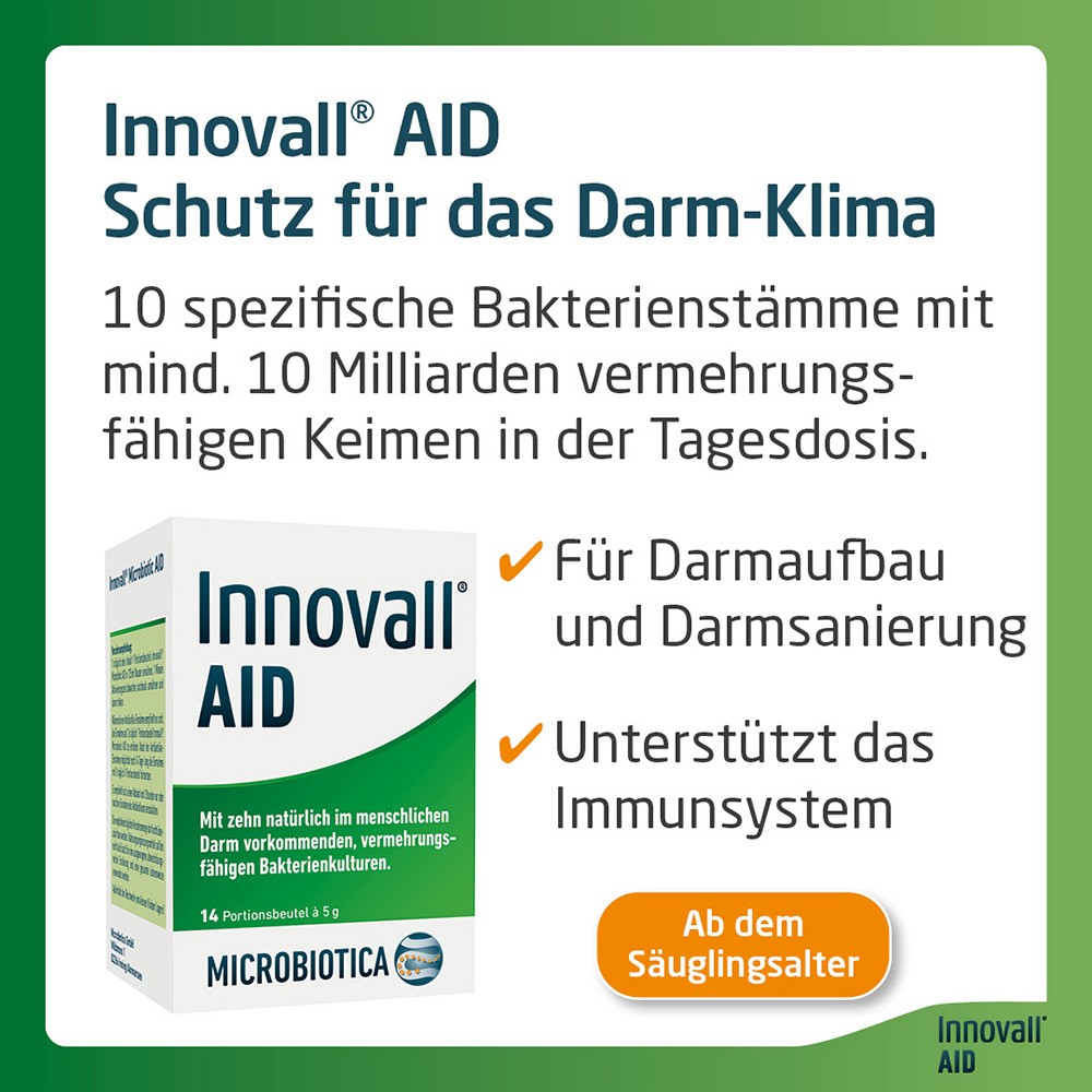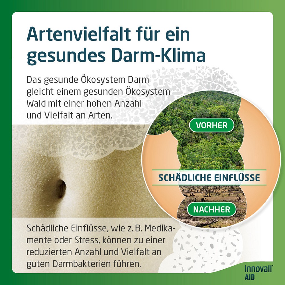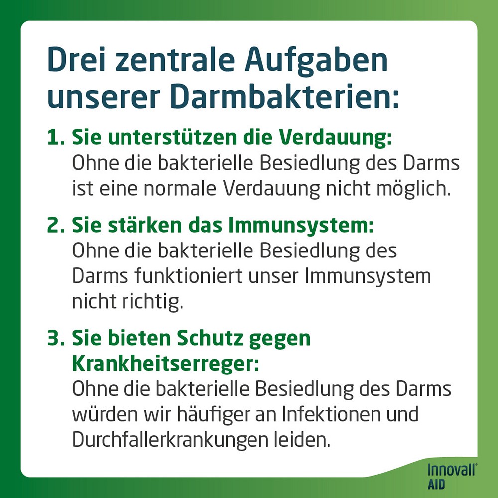 Innovall AID – Nahrungsergänzungsmittel mit 10 natürlich im menschlichen Darm vorkommenden, vermehrungsfähigen Bakterienkulturen und speziellen Nährstoffen für die Vitalität der Bakterien. Die in langjähriger Forschungsarbeit entwickelte Zusammensetzung aus 10 spezifischen Bakterienstämmen und speziellen Nährstoffen ist resistent gegen Magen- und Gallensäure.So überstehen die Darmbakterien in Innovall AID die lange Magen-Darmpassage unbeschadet bis zu ihrem Wirkort. Die Kombination von unterschiedlichen Bakterienstämmen bewirkt, dass diese sich besser im Darm ansiedeln und vermehren und das Wachstum von unerwünschten Bakterien reduzieren können.