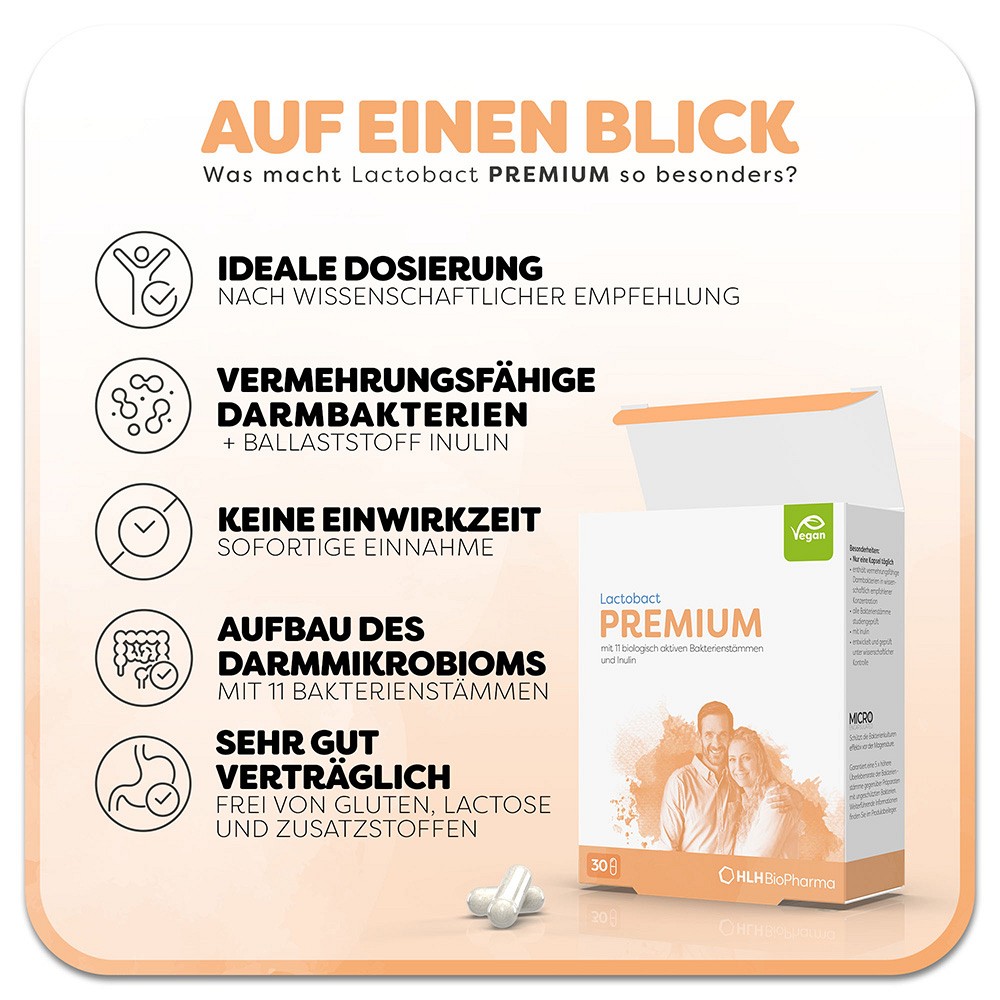 Lactobact PREMIUM, das Probiotikum für Personen ab 8 Jahren, vom Qualitätsführer HLH BioPharma enthält 11 probiotische Bakterienstämme.Das Produkt trägt zur Förderung einer ausgewogenen Darmmikrobiota (Darmflora) bei.