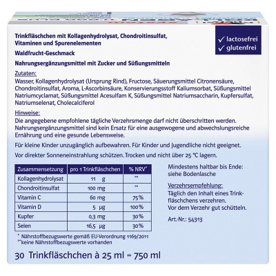 Vitamin-Spurenelement-Kombination aus Vitamin C, D, Selen und Kupfer plus 100 mg Chondroitinsulfat Plus 11 g KollagenhydrolysatDie aufeinander abgestimmten Nährstoffe sind im praktischen Trinkfläschchen enthalten - sofort trinkfertig mit wohlschmeckendem Waldfrucht-Geschmack - ideal für unterwegs.