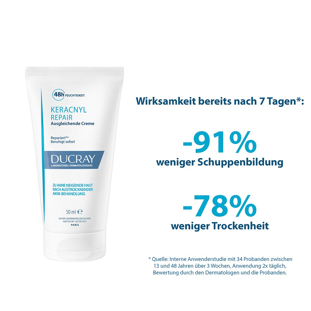 Die KERACNYL REPAIR CREME gleicht die Nebenwirkungen von Isotretinoin bei einer oralen Pickel/Akne Behandlung aus und beruhigt die Haut sofort.- Gleicht die Nebenwirkungen von Isotretinoin aus und beruhigt die Haut sofort