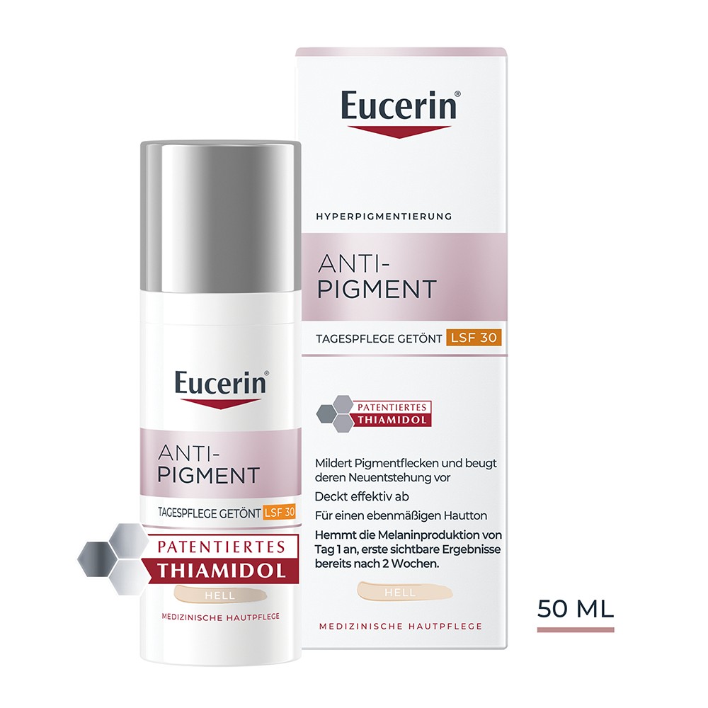 Mit der Eucerin Anti-Pigment Tagescreme mit patentiertem Thiamidol kann Pigmentflecken direkt am Ursprung entgegengewirkt sowie diese über die Zeit reduziert werden. Dank des enthaltenen LSF 30 bietet die Anti Pigment Creme zusätzlich sicheren Schutz vor der Entstehung neuer sonnenbedingter Pigmentflecken. MIt UVA-, UVB und Blue Light-Schutz ist sie eine ideale Tagespflege gegen Photoaging.Zudem ist die Formel mit mineralischen Farbpigmenten äußerst schnell einziehend, deckt Pigmentflecken sofort ab und sorgt so für ein natürliches sowie gleichmäßiges Hautbild. Als getönte Tagespflege verleiht die Eucerin Creme mit LSF ohne Octocrylene eine leichte, natürliche Deckkraft, was 93 % der Teilnehmenden einer Studie bestätigten*.