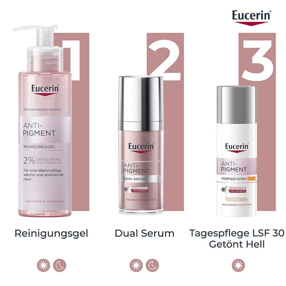 Sanfte Reinigung für die tägliche Anwendung für alle Hauttypen: Das Gesicht gründlich mit dem Eucerin Anti-Pigment Reinigungsgel reinigen.Eucerin Anti-Pigment Tagespflege LSF 30 Getönt Hell täglich morgens auf Gesicht, Hals und Dekolleté auftragen und sanft einmassiern, dabei direkten Augenkontakt vermeiden. Für beste Ergebnisse als Ergänzung das Anti-Pigment Dual Serum verwenden.
