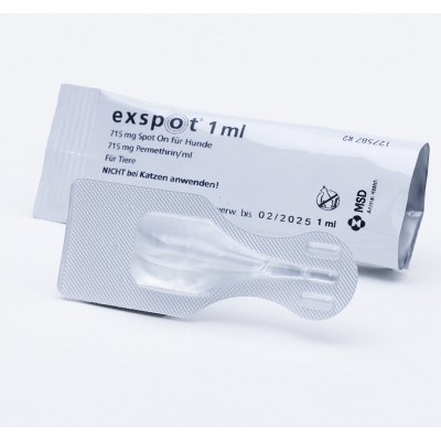 WIE SOLL EXSPOT® VERABREICHT WERDEN?Zunächst öffnen Sie den Aluminiumbeutel und entnehmen die Pipette. Teilen Sie nun das Fell auseinander und tröpfeln Sie die zu applizierende Menge auf die Haut. Hierbei ist es notwendig das Körpergewicht des Hundes zu beachten.Bei Hunden bis maximal 15 kg Körpergewicht wird der Inhalt einer Pipette (1 ml) zwischen die Schulterblätter geträufelt. Hierbei scheiteln Sie das Fell auf dem Rücken im Bereich zwischen den Schulterblättern, bis die Haut sichtbar wird und Sie die Pipettenspitze auf die Haut setzen können. Anschließend drücken Sie die Pipette aus, um den gesamten Inhalt der Pipette auf die Haut aufzutragen. Bei größeren Hunden ab 15 kg Körpergewicht sollten Sie 2 ml (2 x 1 Pipette mit 1 ml oder 1 Pipette mit 2 ml) gleichmäßig an zwei unterschiedlichen Stellen (jeweils 1 ml) entlang der Rückenlinie von der Schulter bis zur Schwanzwurzel auftragen. ANWENDUNGSGEBIETE VON EXSPOT®Exspot® schützt Ihren Hund vor:• Flöhen (Ctenocephalides canis, C. felis, wirkt bis zu vier Wochen) • Zecken (Rhipicephalus sanguineus, Ixodes ricinus, wirkt bis zu vier Wochen) • Schmetterlings-/Sandmücken (Phlebotomus perniciosus, wirkt mind. über zwei Wochen) |