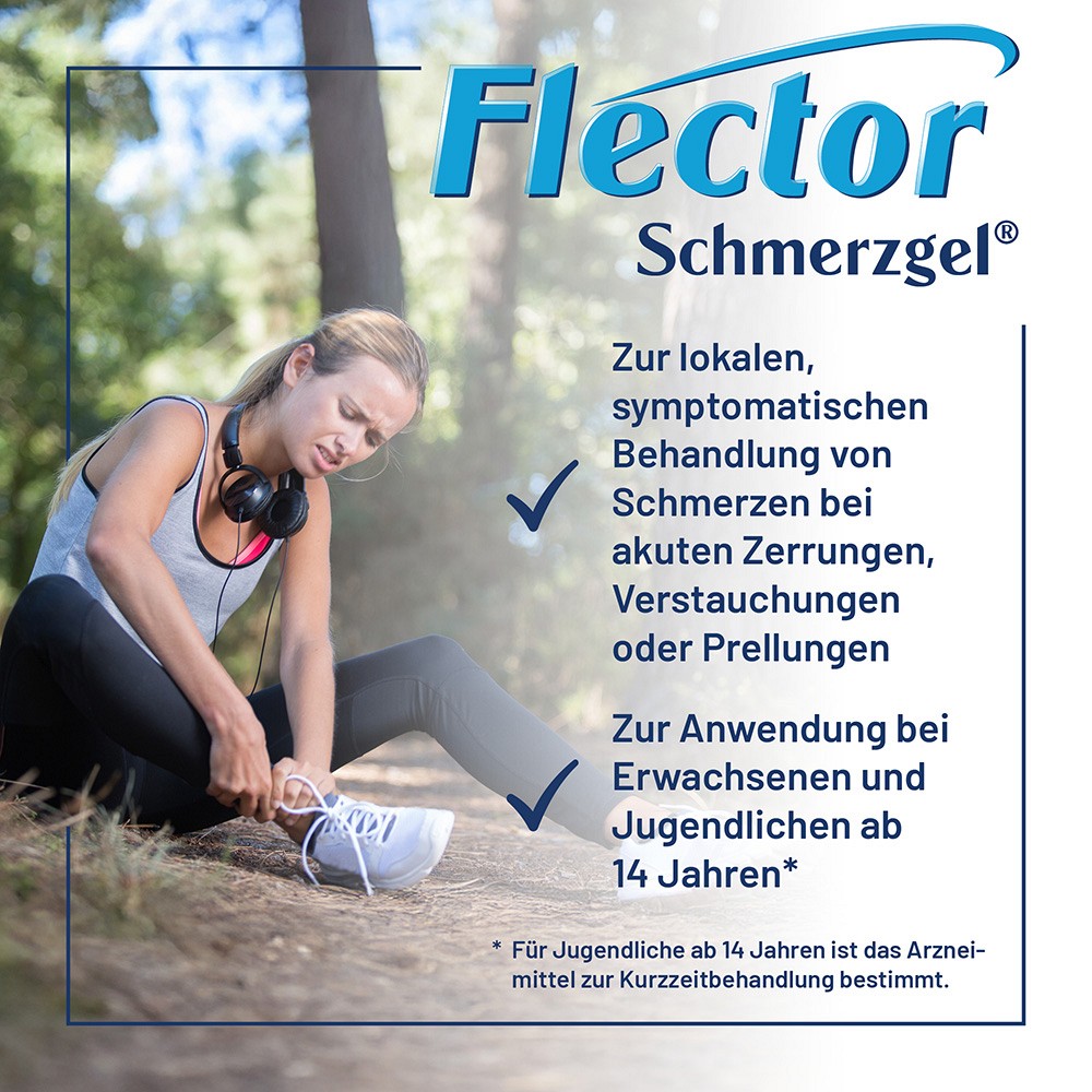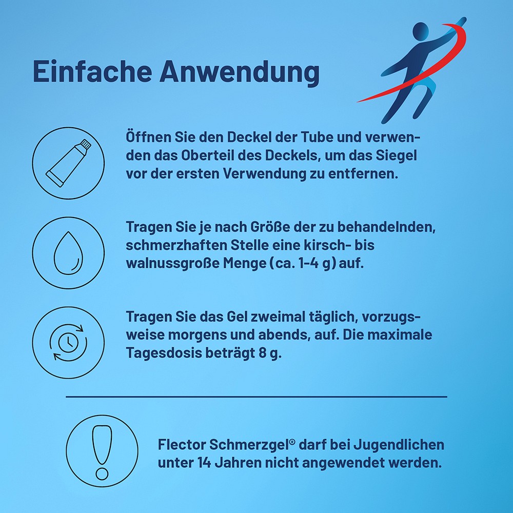 Je nach Größe der zu behandelnden schmerzhaften Stelle ist eine kirsch- bis walnussgroße Menge, entsprechend 1-4 g Gel, aufzutragen. Flector Schmerzgel ist zweimal täglich (vorzugsweise morgens und abends) aufzutragen.Die maximale Tagesdosis beträgt 8 g Gel.