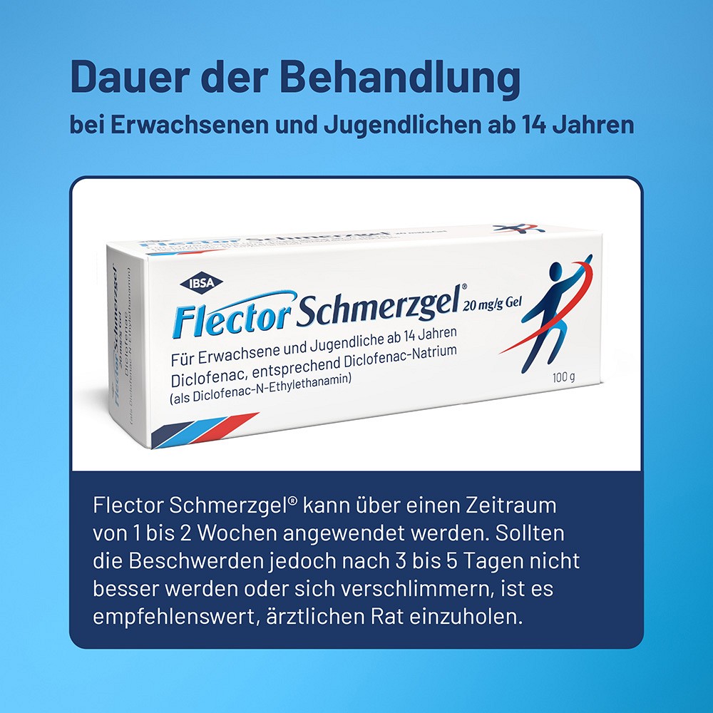Die Dauer der Anwendung richtet sich nach dem Anwendungsgebiet und dem Ansprechen des Patienten auf die Behandlung. Flector Schmerzgel sollte ohne ärztlichen Rat nicht länger als 1-2 Wochen angewendet werden. Suchen Sie einen Arzt auf, wenn sich die Beschwerden verschlimmern oder sich nach 3-5 Tagen nicht gebessert haben.Wenn Sie eine größere Menge von Flector Schmerzgel angewendet haben, als Sie sollten