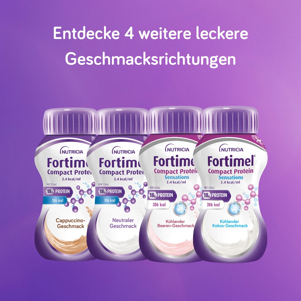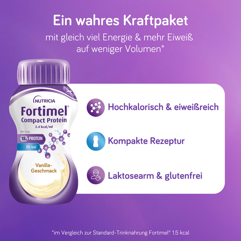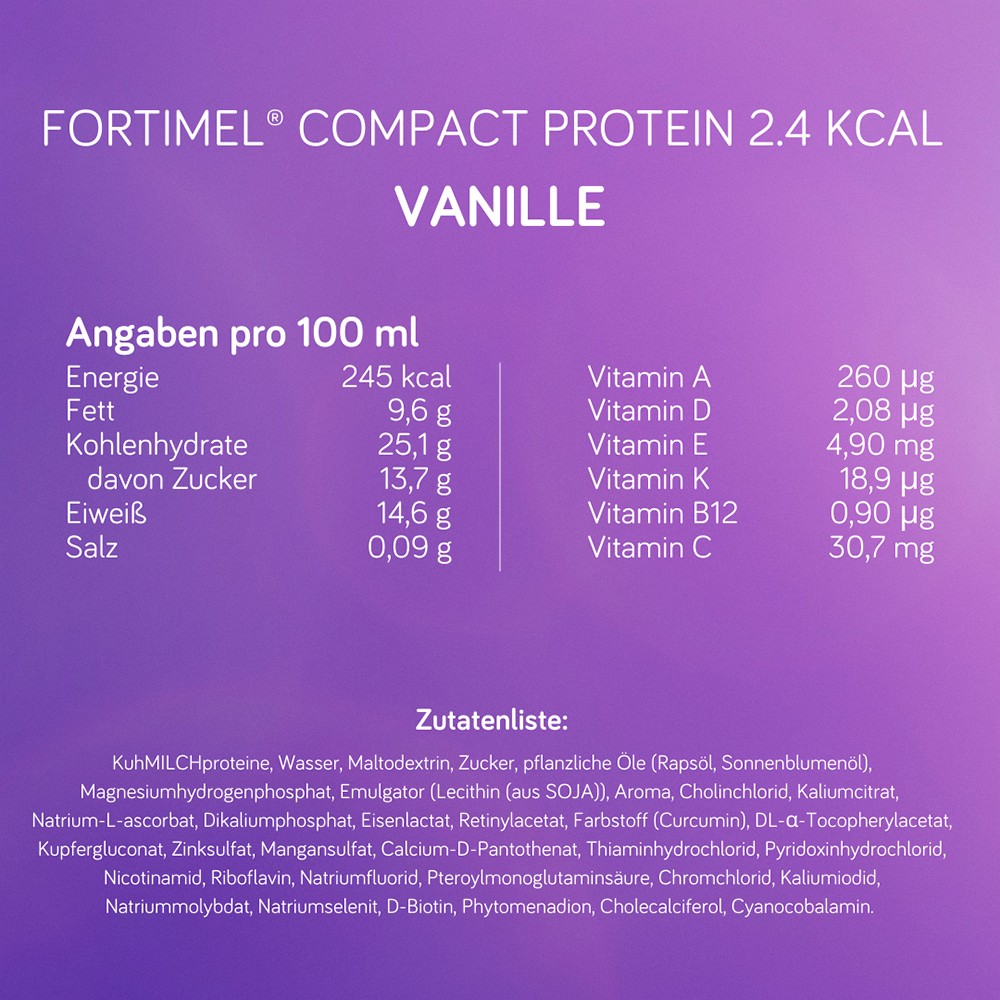 - Kompakt und eiweißreich: Die Fortimel Compact Protein 2.4 kcal Trinkmahlzeit mit Vanillegeschmack versorgt den Körper mit Energie und allen wichtigen Nährstoffen Die kompakte Rezeptur der Trinkkost enthält 306 kcal und 18 g Eiweiß in nur 125 ml - ideal für Menschen, die nur kleine Mengen zu sich nehmen können